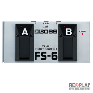 Two switches in one, The Boss FS-6 combines latch-type and momentary-type switching into one unit. With two switches conveniently housed side-by-side, the FS-6 allows each switch to be set for latch or momentary operation. Pick the configuration that best suits your playing style and setup. Operates via 9 volt battery.