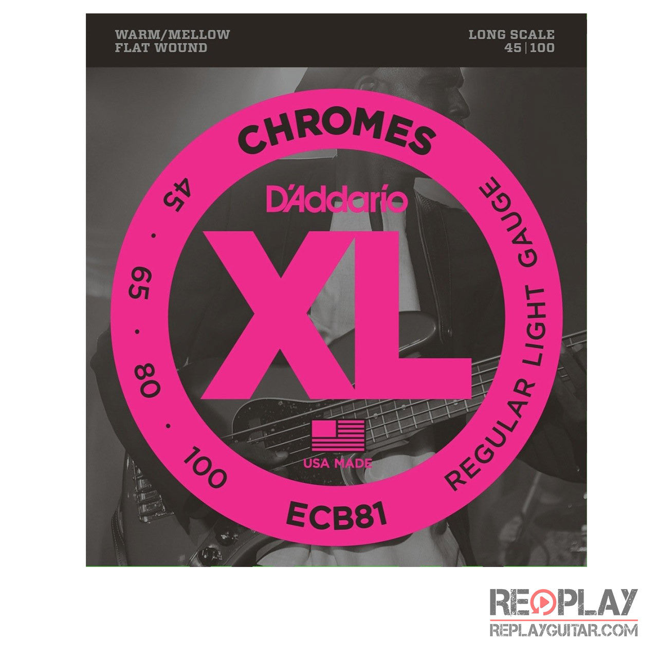 ECB81, D'Addario's best-selling Flatwound bass strings, are known for their warm, mellow tone and smooth polished feel. Chromes deliver a deep, rich low bottom end which makes them the flat wound choice of Jazz, R&B and Pop musicians. Fits long scale basses with a string scale length of up to 36 1/4 inches.