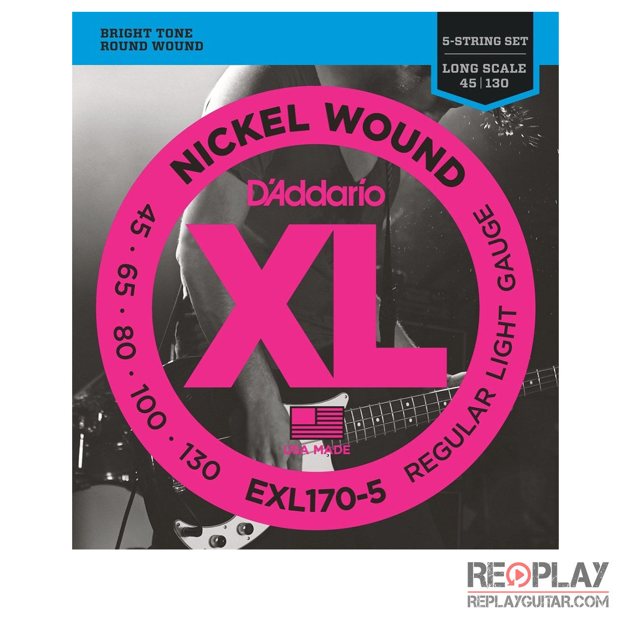 EXL170-5 is the 5-string version of the best-selling D’Addario bass set. With the addition of the .130 low B string, EXL170 offers the ideal combination of distinctive brightness and booming, tight lows. The most versatile and universally appealing set for all playing styles. Fits long scale basses with a string scale length of up to 36 1/4 inches.