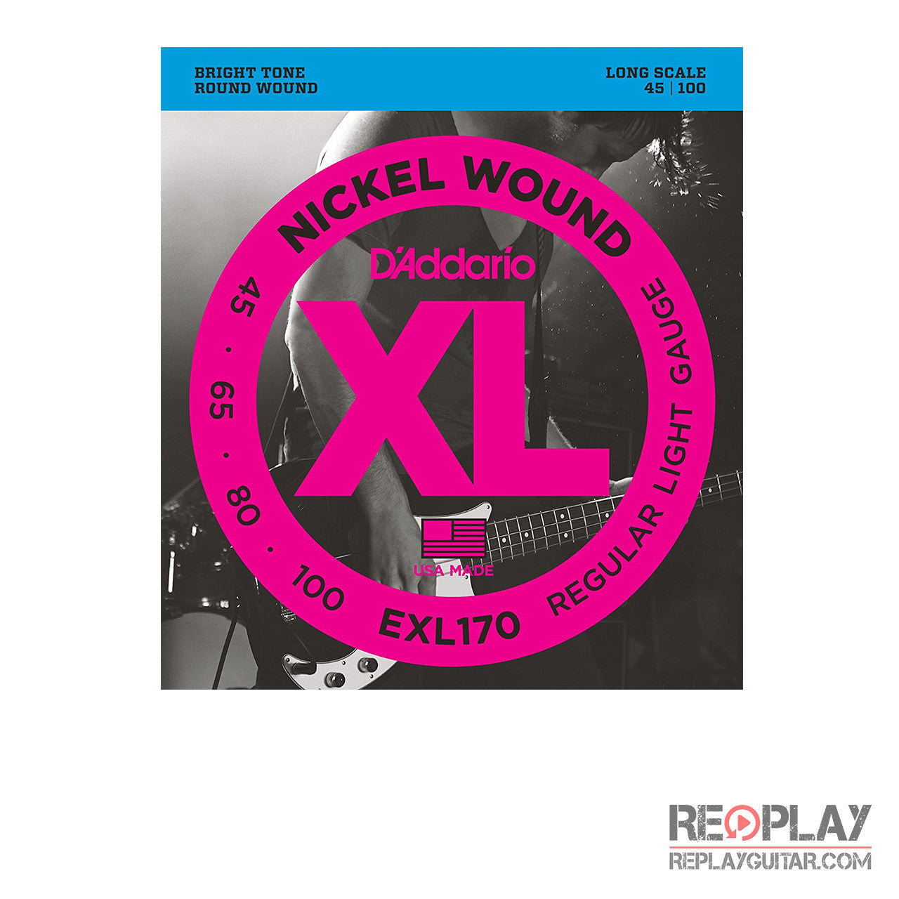 EXL170, D'Addario's best-selling bass set and the standard for most electric basses, offers the ideal combination of bright, booming tone and comfortable feel. The most versatile and universally appealing set for all playing styles. Fits long scale basses with a string scale length of up to 36 1/4 inches. D'Addario XL Nickel Wound Electric Bass strings are world-renowned as "The Player's Choice" amongst bass players of all genres and styles. All XL strings are precision wound on our exclusive digitally-controlled machines, ensuring each string has excellent intonation, clear fundamentals, and unparalleled consistency. Each string is wound with a nickelplated steel wrap wire known for distinctive bright tone with excellent magnetic output delivering a universally appealing and versatile tone for all playing styles.