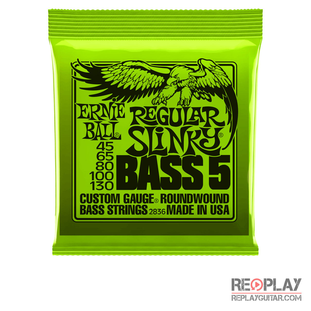Ernie Ball Regular Slinky 5 String Bass sets are wound for a bright, balanced tone. Each bass string is manufactured with the finest and freshest raw materials in the beautiful Coachella Valley of Southern California. The list of endorsers for Ernie Ball Slinky bass strings reads like a who's who of top selling artists. Gauges .045, .065, .080, .100 .130