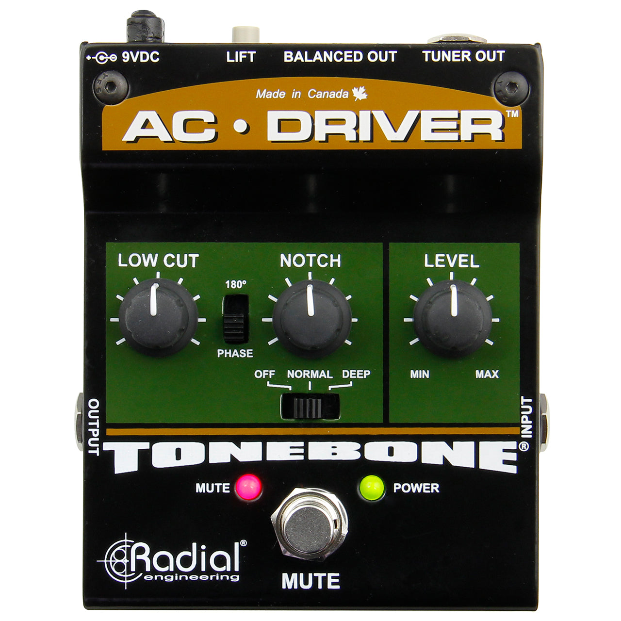 The Radial AC-Driver is an acoustic instrument preamp designed for use on stage, with helpful features to streamline your performance and ensure the best possible tone from your instrument.